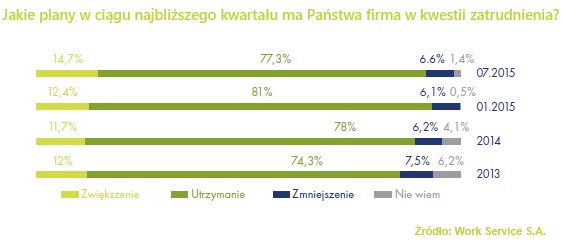 Dobra sytuacja gospodarcza znajduje odzwierciedlenie w deklaracjach pracodawców, którzy w zdecydowanej większości (77%) zakładają utrzymanie obecnego poziomu miejsc pracy oraz aktualnego poziomu płac (86%). Rośnie jednak odsetek firm planujących zwiększanie zatrudnienia w najbliższych trzech miesiącach – 14,7% pracodawców. To o 2 p.p. więcej niż w I kwartale 2015 roku. Kolejnych 13,6% pracodawców planuje utrzymać obecny stan poprzez nowe rekrutacje. Ponad połowa przedsiębiorców zatrudniać będzie pracowników średniego i niższego szczebla (odpowiednio 56% i 52%). Blisko co dziesiąta firma poszukuje kadry zarządzającej.
