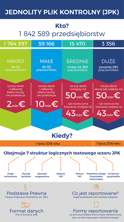 Wdrożenie Jednolitego Pliku Kontrolnego (JPK) jest związane z ustawą z dnia 10 września 2015r. o zmianie ustawy - Ordynacja podatkowa oraz niektórych innych ustaw (Dz. U. z 2015 r. poz. 1649), która do Ordynacji podatkowej wprowadziła art. 193a, który nakłada na przedsiębiorców obowiązek udostępniania organom podatkowym informacji w spójnej formie. Przepis ten dla dużych przedsiębiorców wejdzie w życie 1 lipca 2016 r.