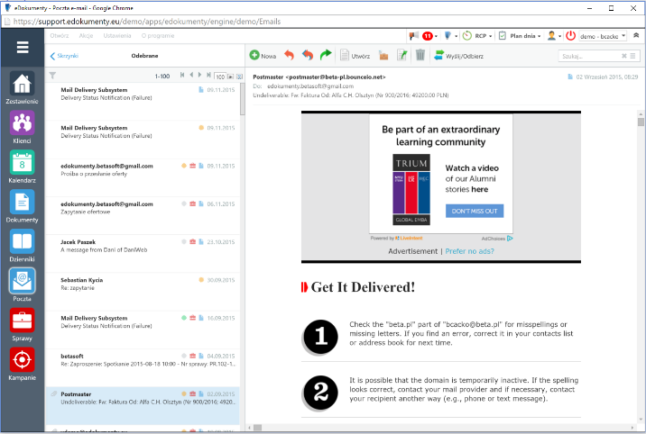 Wbudowany w system zaawansowany klient poczty email za pomocą protokołu IMAP pozwala na wszystko to co zapewniał do tej pory zewnętrzny klient poczty typu Outlook. Obsługuje foldery sieciowe i lokalne, inteligentne foldery wyszukiwania oraz reguły segregacji, a nawet autoresponder. Dodatkowo stwarza możliwość wygodnego przejmowania dokumentów do systemu EOD jak również tworzenia zadań i współdzielenia wiadomości lub całych skrzynek.