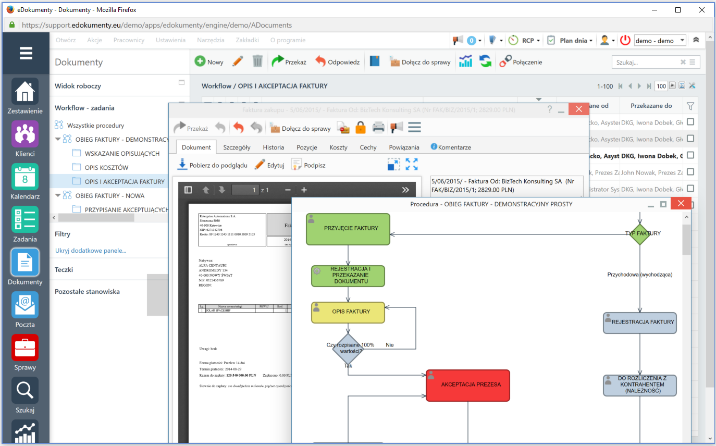 Jedną z najważniejszych zalet systemu eDokumenty jest w pełni profesjonalny silnik workflow, który pozwala projektować dowolne procesy za pomocą graficznego narzędzia zgodnego ze standardem BPMN.