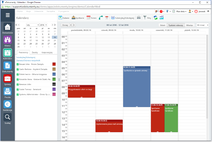 Wykorzystanie wspólnych kalendarzy pozwala na znacznie lepszą współpracę i planowanie zadań. Zdarzenia widoczne w kalendarzu posiadają kontekst klienta i projektu/sprawy skąd szybko można przejść do powiązanych dokumentów. Oprócz kalendarzy pracowników obsługa obejmuje kalendarz zasobów oraz kalendarze korporacyjne.