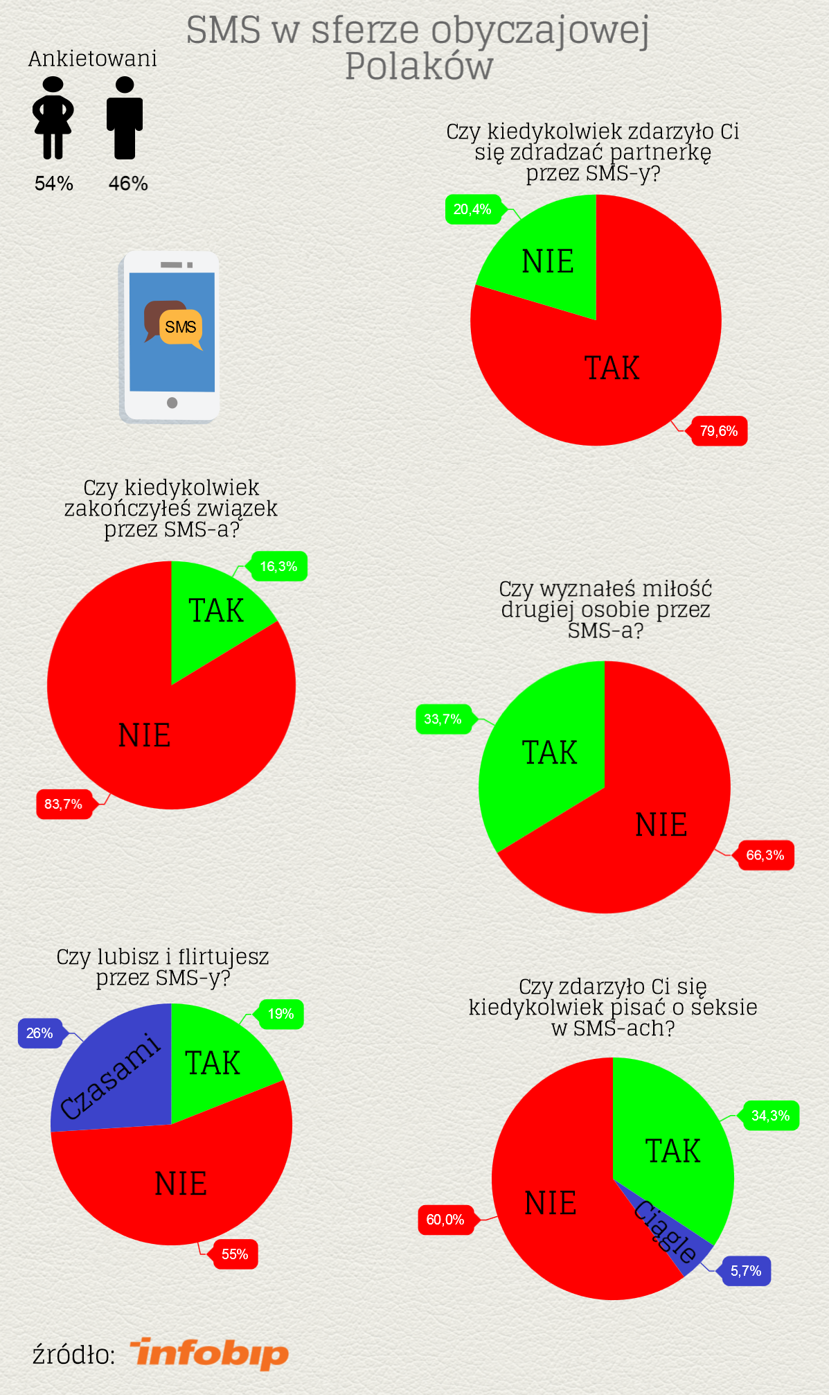 Na pytanie, czy kiedykolwiek zdradziłeś swoją partnerkę przez SMS-y, twierdząco odpowiedziało 20% badanych. Z kolei aż 45% potwierdziło, że za pomocą krótkich wiadomości tekstowych romansuje z innymi osobami. Takie flirtowanie dla 19% przepytywanych osób skończyło się znalezieniem nowego partnera, a 34% wyznało miłość innej osobie właśnie poprzez wiadomość SMS. 29% respondentów wskazało, że zdarzyło im się spędzić całą noc na pisaniu SMS-ów z partnerem. Dla 40% uczestników badania jednym z tematów był seks. Polacy nie tylko poznają nowe osoby i zakochują się poprzez SMS-y, ale taką formę komunikacji wybierają również aby powiadomić partnera o zakończeniu związku. 16% ankietowanych przyznało, że zrobiło to właśnie poprzez wysłanie wiadomości tekstowej.