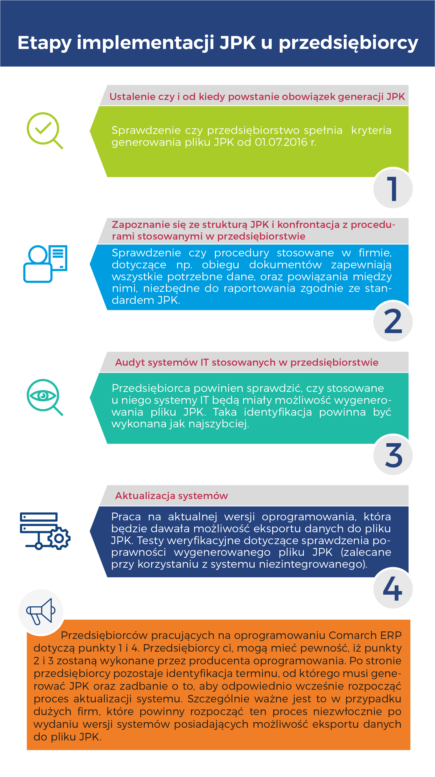 Dostawcy dokonują modyfikacji i rozwijania systemów permanentnie, w ramach usług wsparcia technicznego. W większości przypadków nie powinno to wykraczać poza standardową usługę wsparcia. Jednakże w przypadku przedsiębiorstw działających na zintegrowanych systemach różnych dostawców, jak również wykorzystujących dedykowane dla nich rozwiązania, implementacja JPK może być skomplikowanym i czasochłonnym procesem. Dlatego już teraz duże przedsiębiorstwa, które mają być objęte przesyłaniem danych finansowych w formie JPK od 1 lipca 2016 r., powinny skontaktować się z dostawcami oprogramowania, aby sprawnie dostosować swoje systemy do nowych obowiązków.